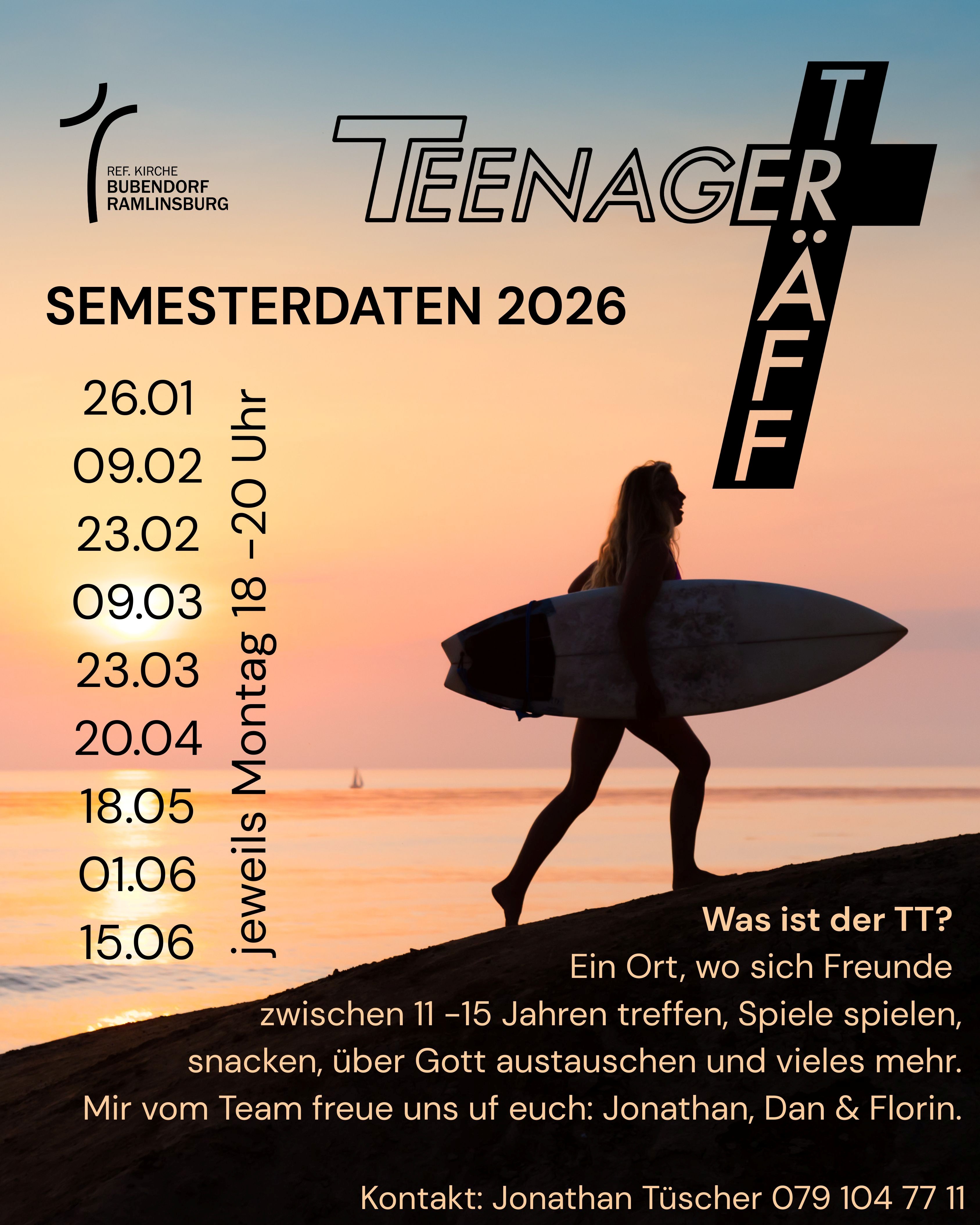 Treffe Freunde, höre spannende Inputs, spiele tolle Spiele und geniesse feine Snacks im Teenagerträff in der Kirche Bubendorf!